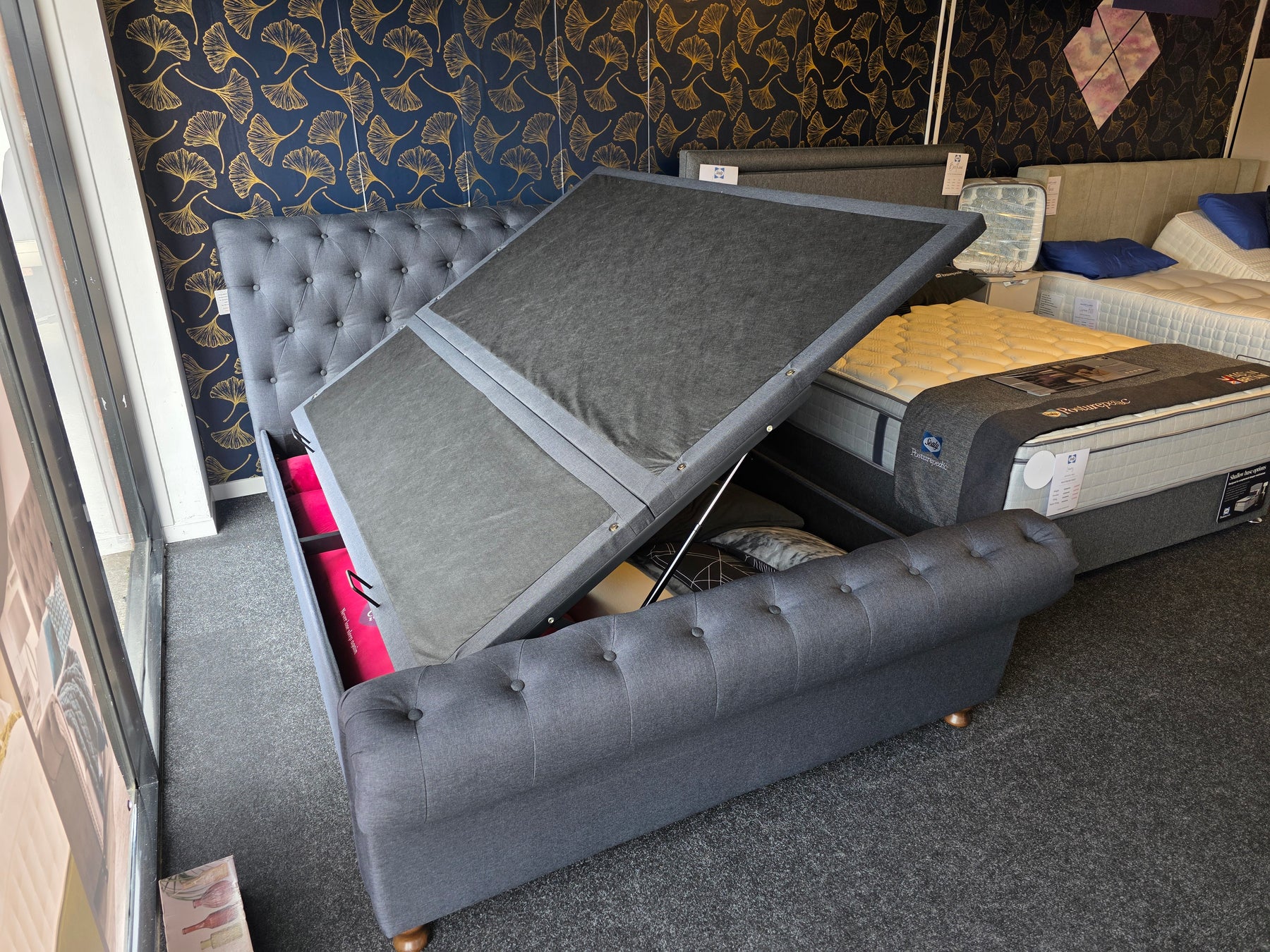 Upgrade your bedroom with our Regent Ottoman Bed Frame! This shop floor model clearance offers an amazing price for a king size bed. The dark charcoal color is sleek and modern, and the solid base provides sturdy support. The side lift opening and ample storage space make this bed both practical and stylish. Don't miss out on this deal!