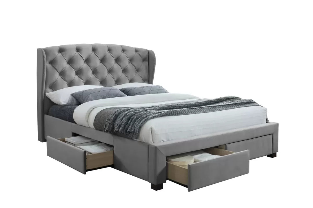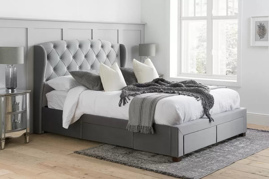 Make a grand style statement with this elegant and contemporary bed frame. Featuring a wingback headboard with tufted detailing and 4 drawers.